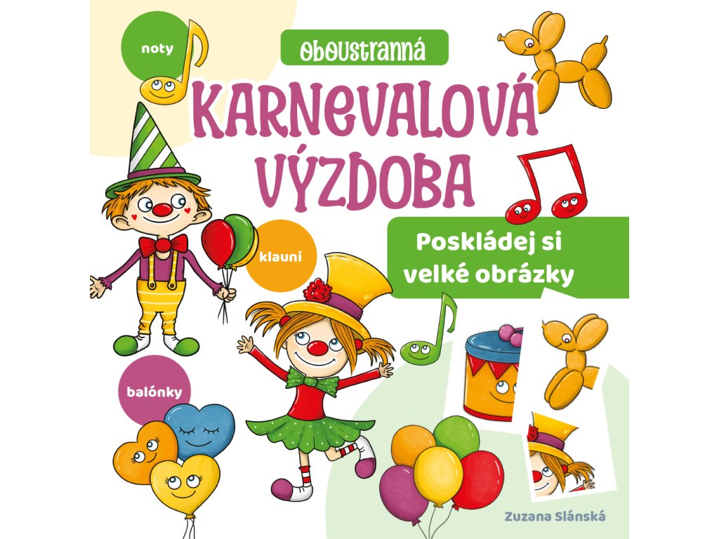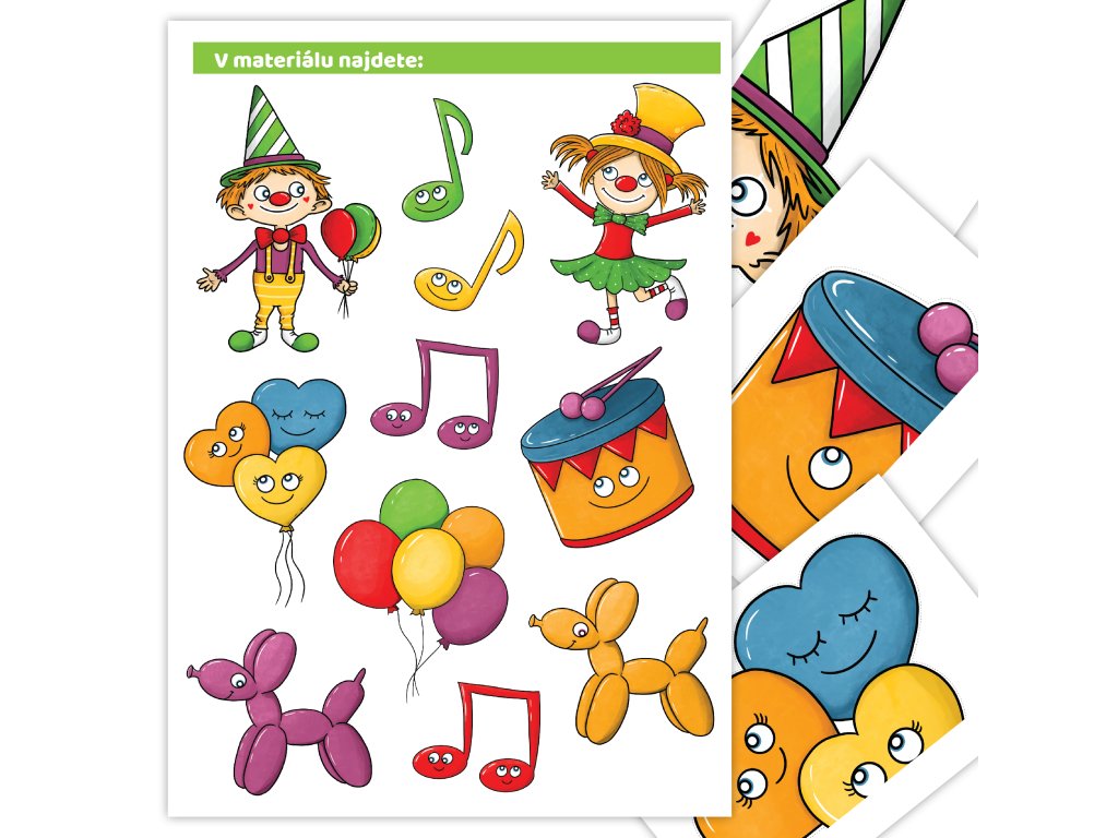 Motivy dvou veselých klaunů jsou doplněny notami, balónky i veselým bubínkem. Vše je sladěno do jednotných barev, aby se vše krásně propojilo.